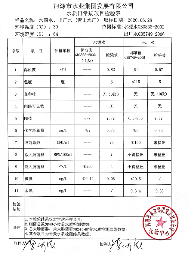 2020年6月28日水質(zhì)檢驗報告