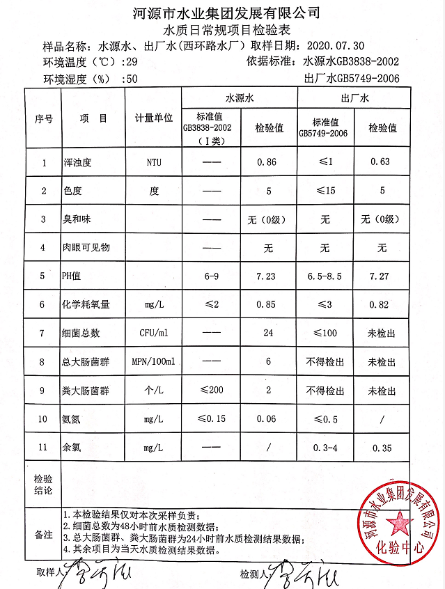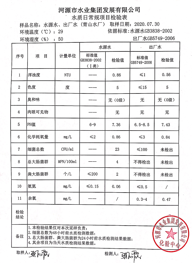 2020年7月30日水質(zhì)檢驗報告