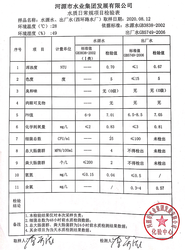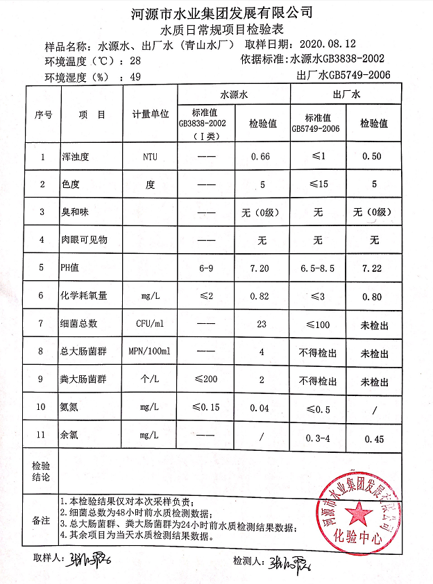2020年8月12日水質(zhì)檢驗報告