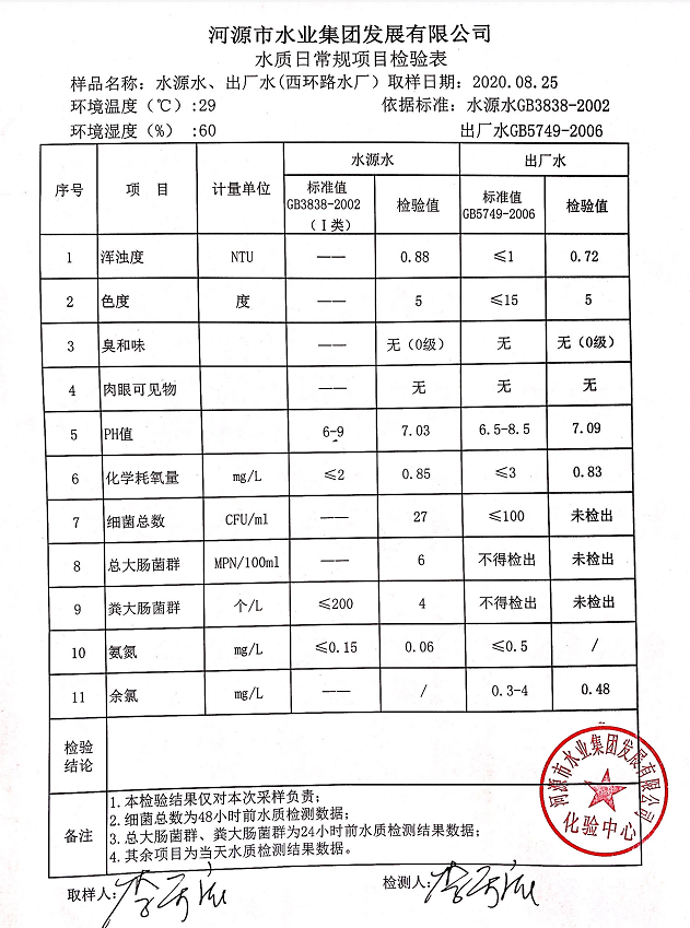 2020年8月25日水質檢驗報告