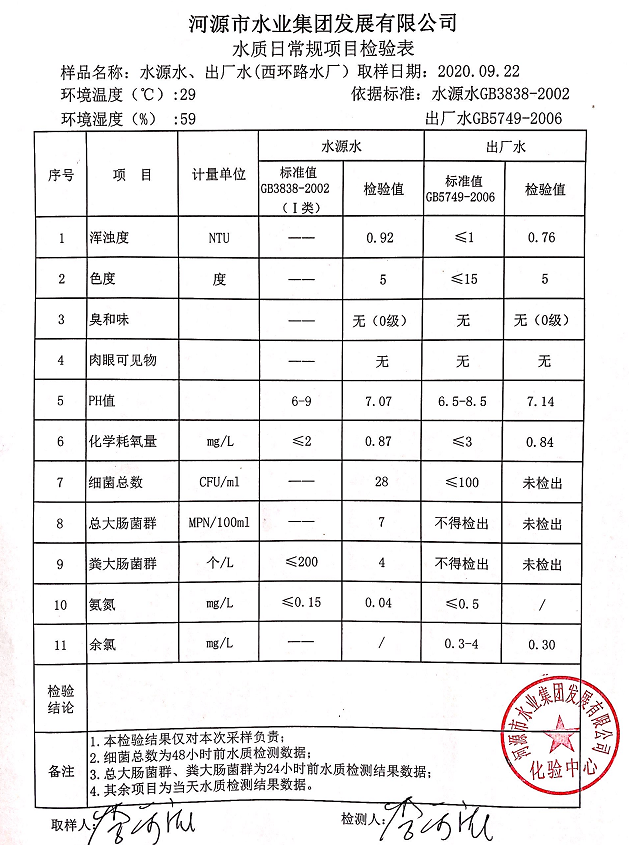 2020年9月22日水質(zhì)檢驗(yàn)報(bào)告