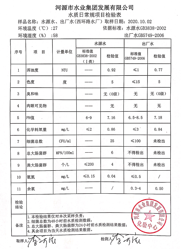 2020年10月2日水質(zhì)檢驗(yàn)報(bào)告