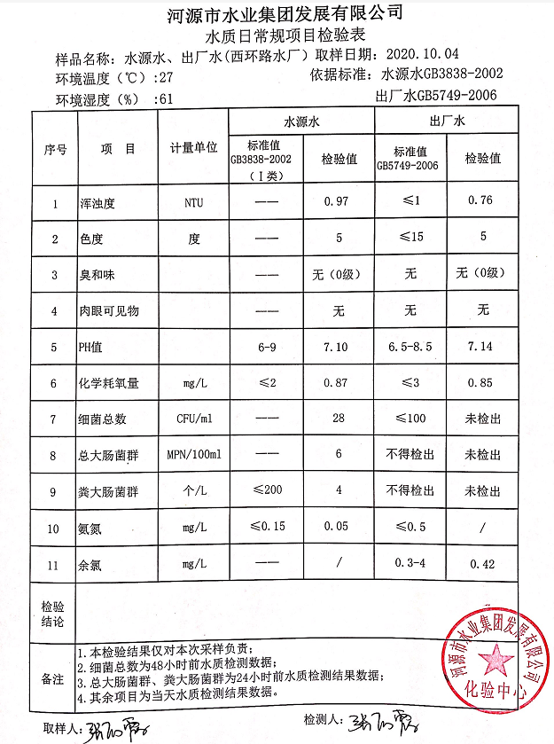 2020年10月4日水質(zhì)檢驗(yàn)報告