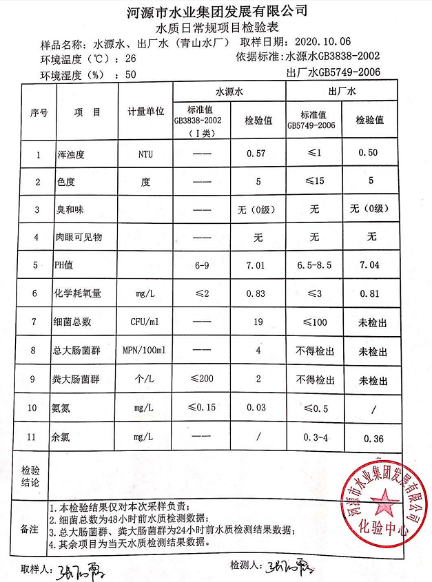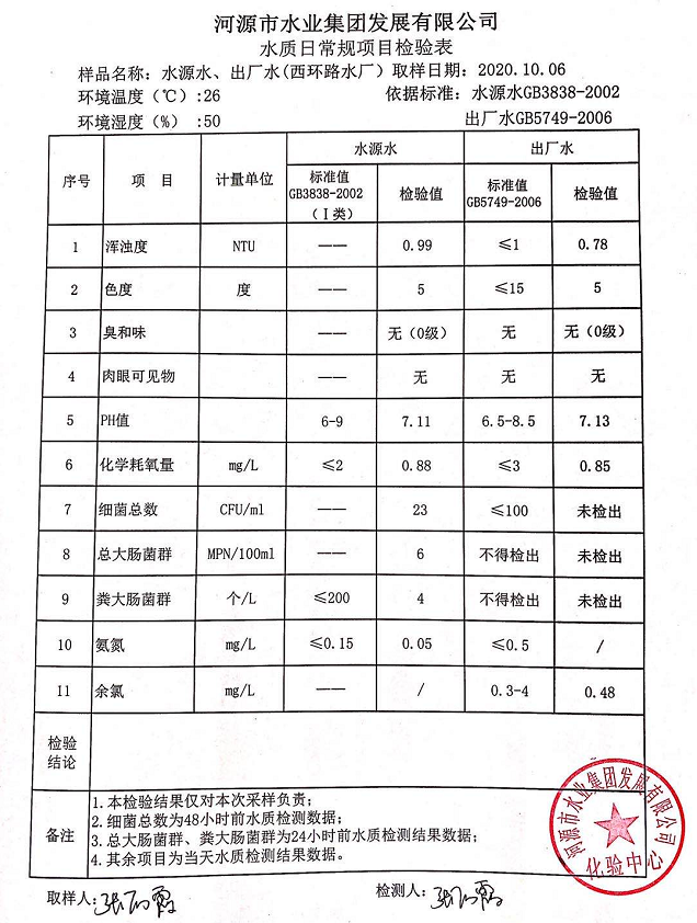 2020年10月6日水質(zhì)檢驗(yàn)報告