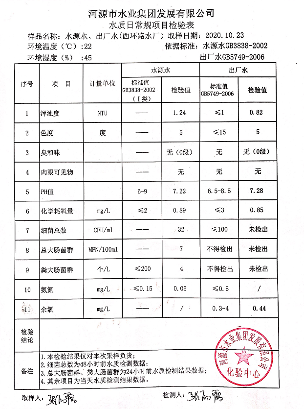 2020年10月23日水質(zhì)檢驗(yàn)報(bào)告