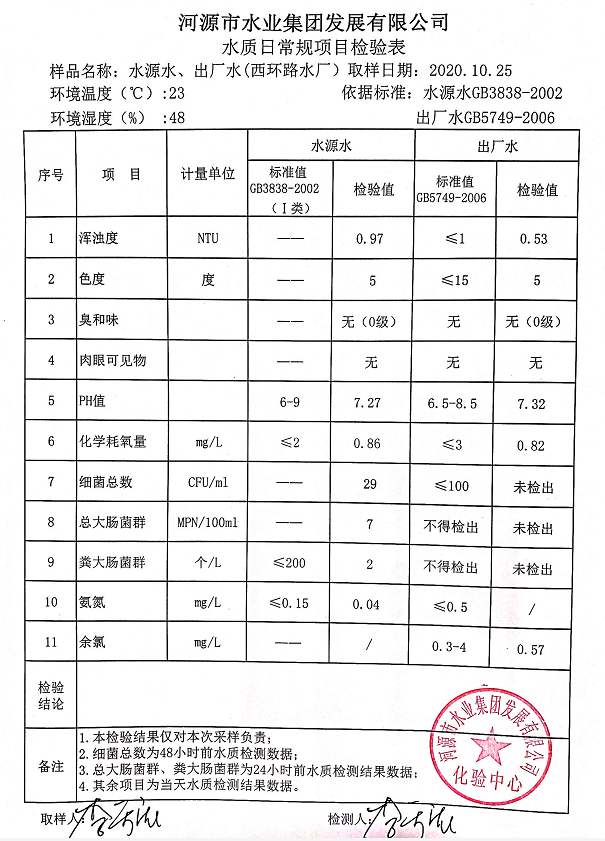 2020年10月25日水質(zhì)檢驗(yàn)報告