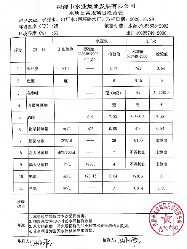 2020年10月29日水質(zhì)檢驗(yàn)報告