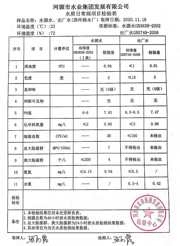 2020年11月16日水質(zhì)檢驗(yàn)報(bào)告