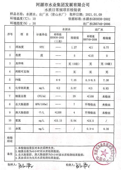 2021年1月9日水質(zhì)檢驗報告