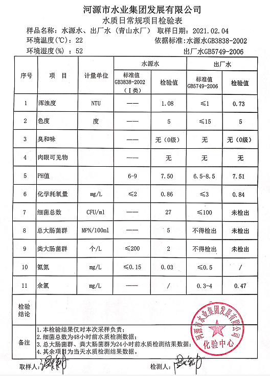 2021年2月4日水質(zhì)檢驗(yàn)報告