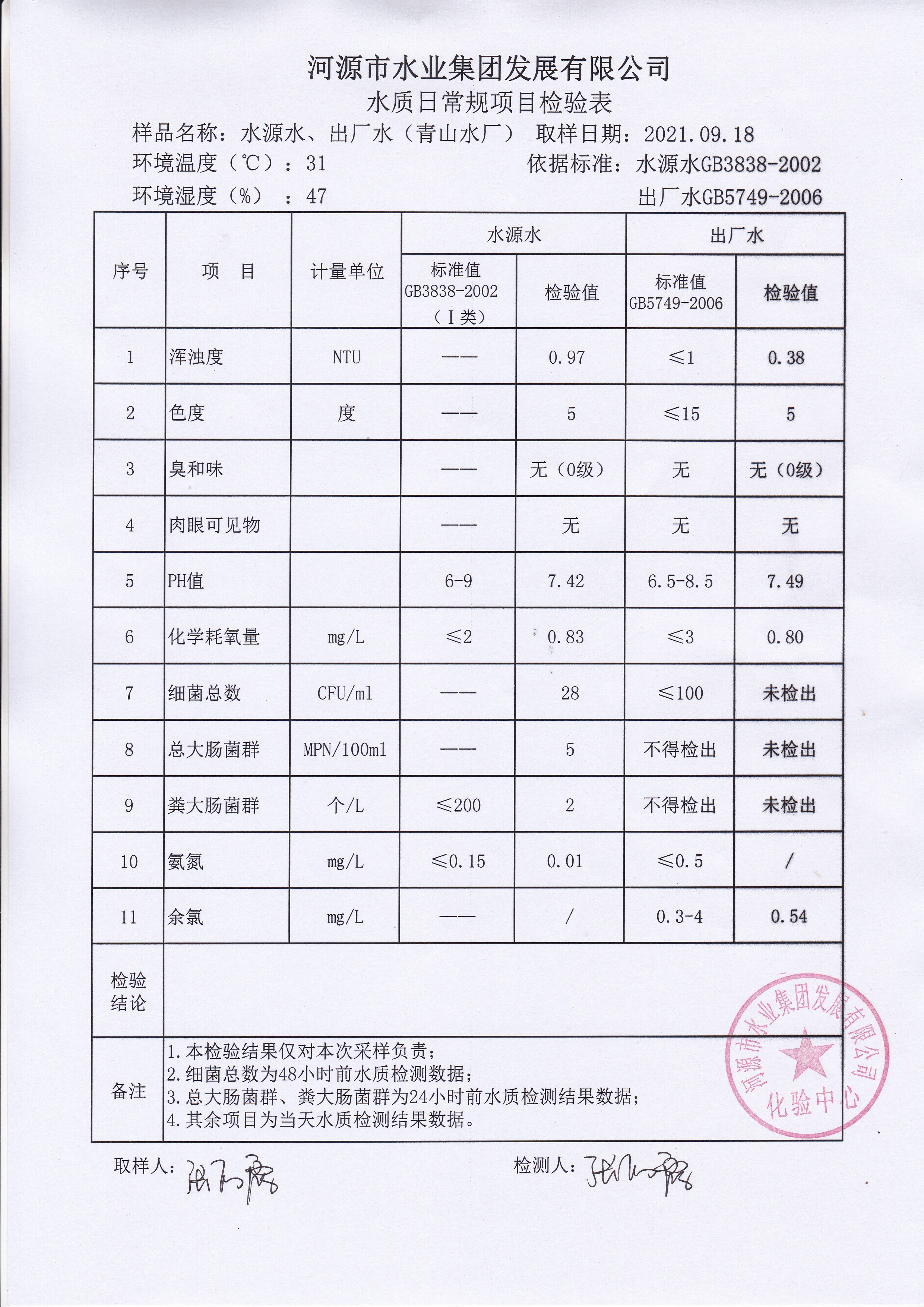 2021年9月1日水質(zhì)檢驗(yàn)報(bào)告 ??