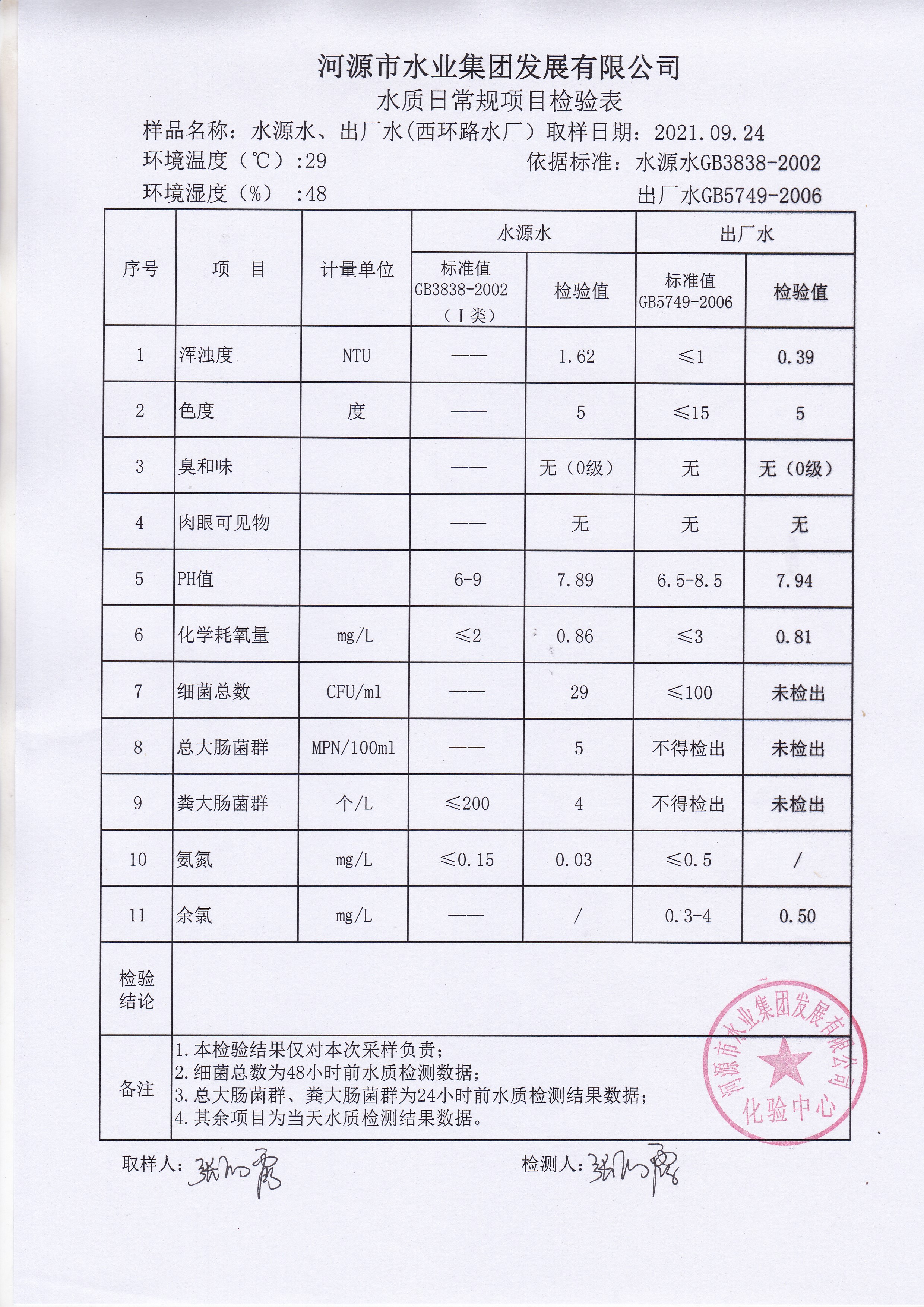 2021年9月24日水質(zhì)檢驗(yàn)報(bào)告