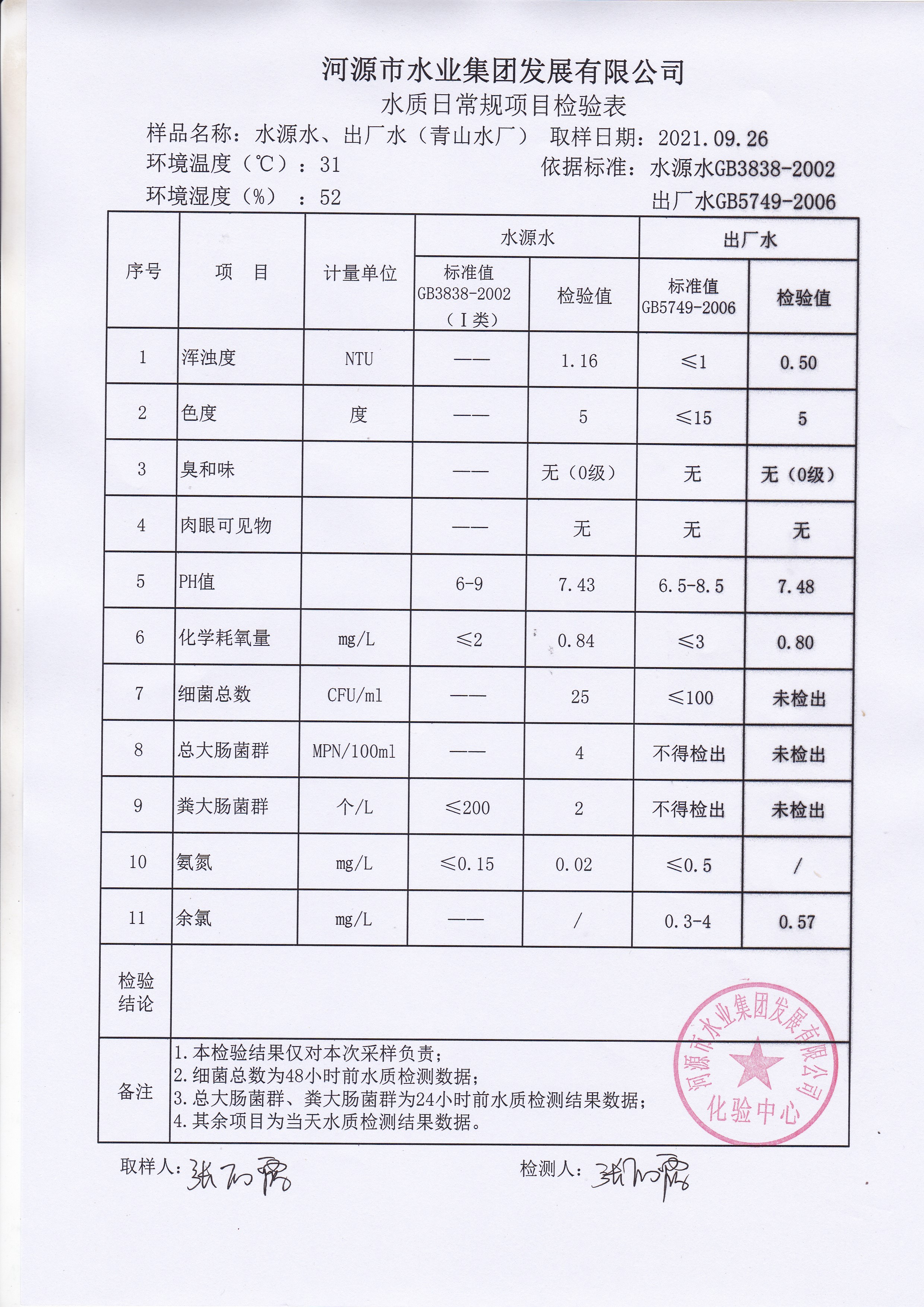 2021年9月26日水質(zhì)檢驗(yàn)報(bào)告