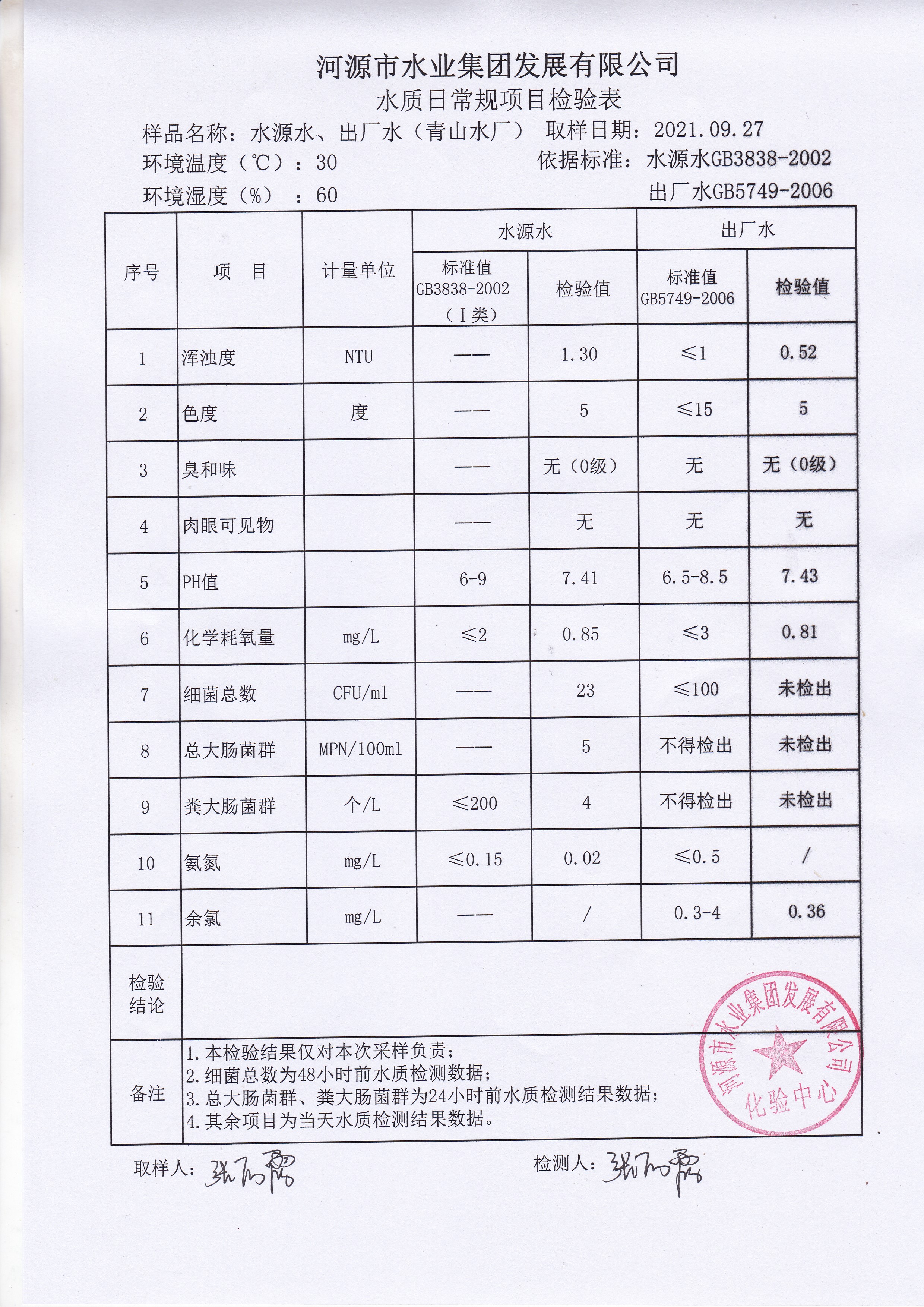 2021年9月27日水質(zhì)檢驗(yàn)報(bào)告