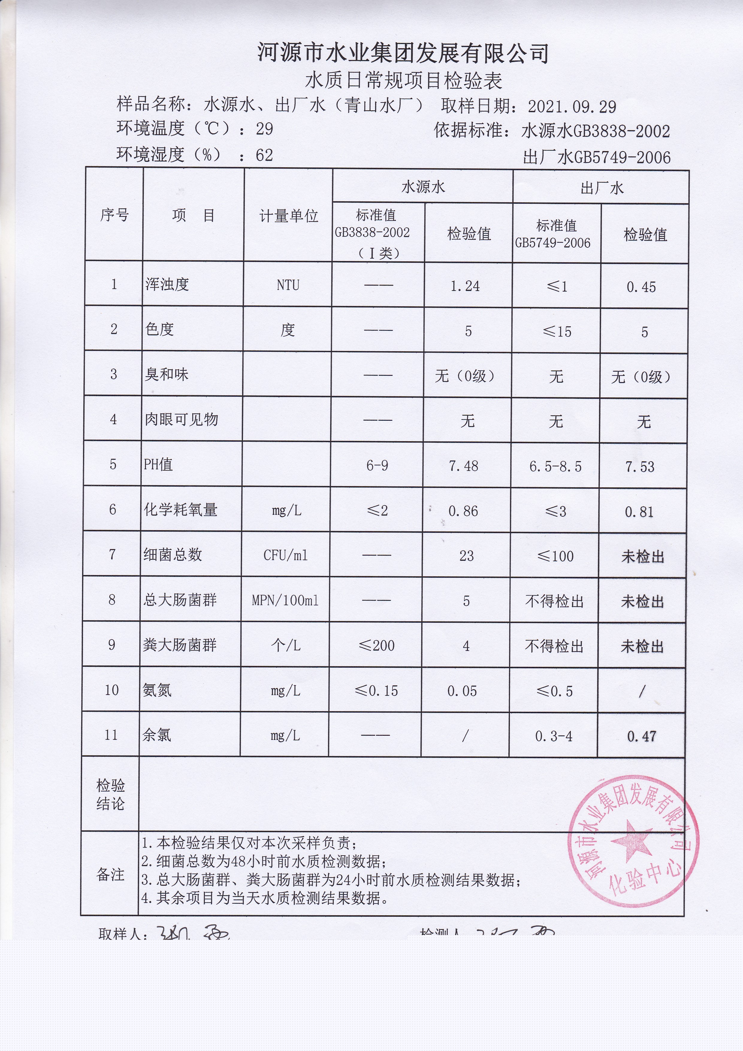 2021年9月29日水質(zhì)檢驗(yàn)報(bào)告