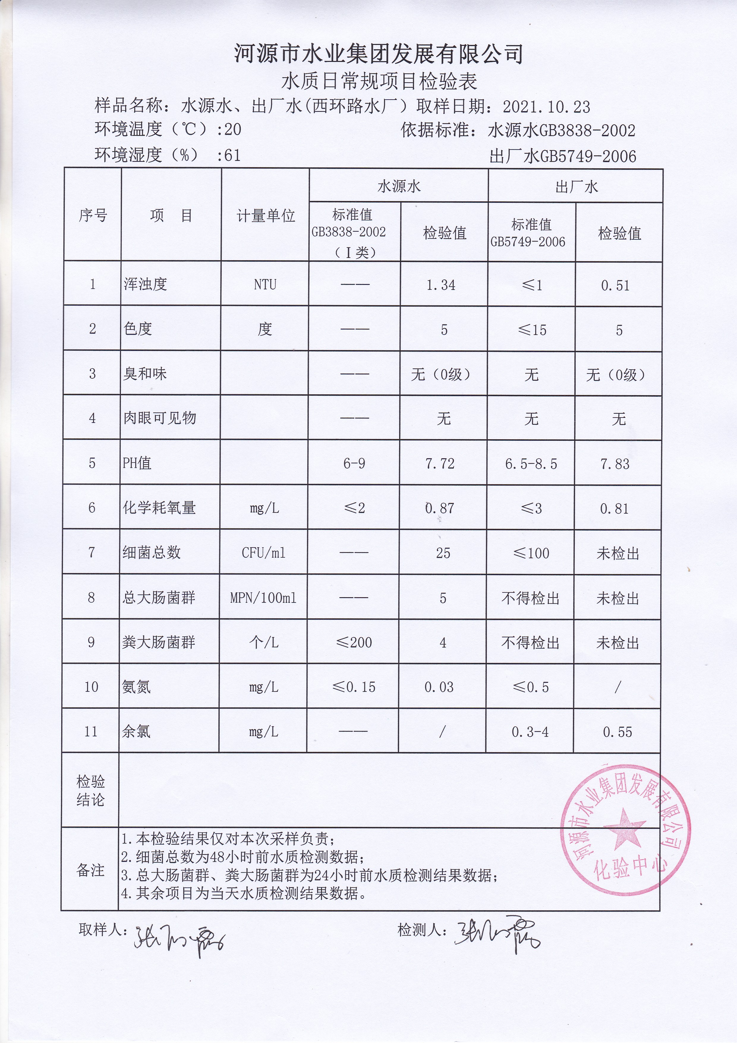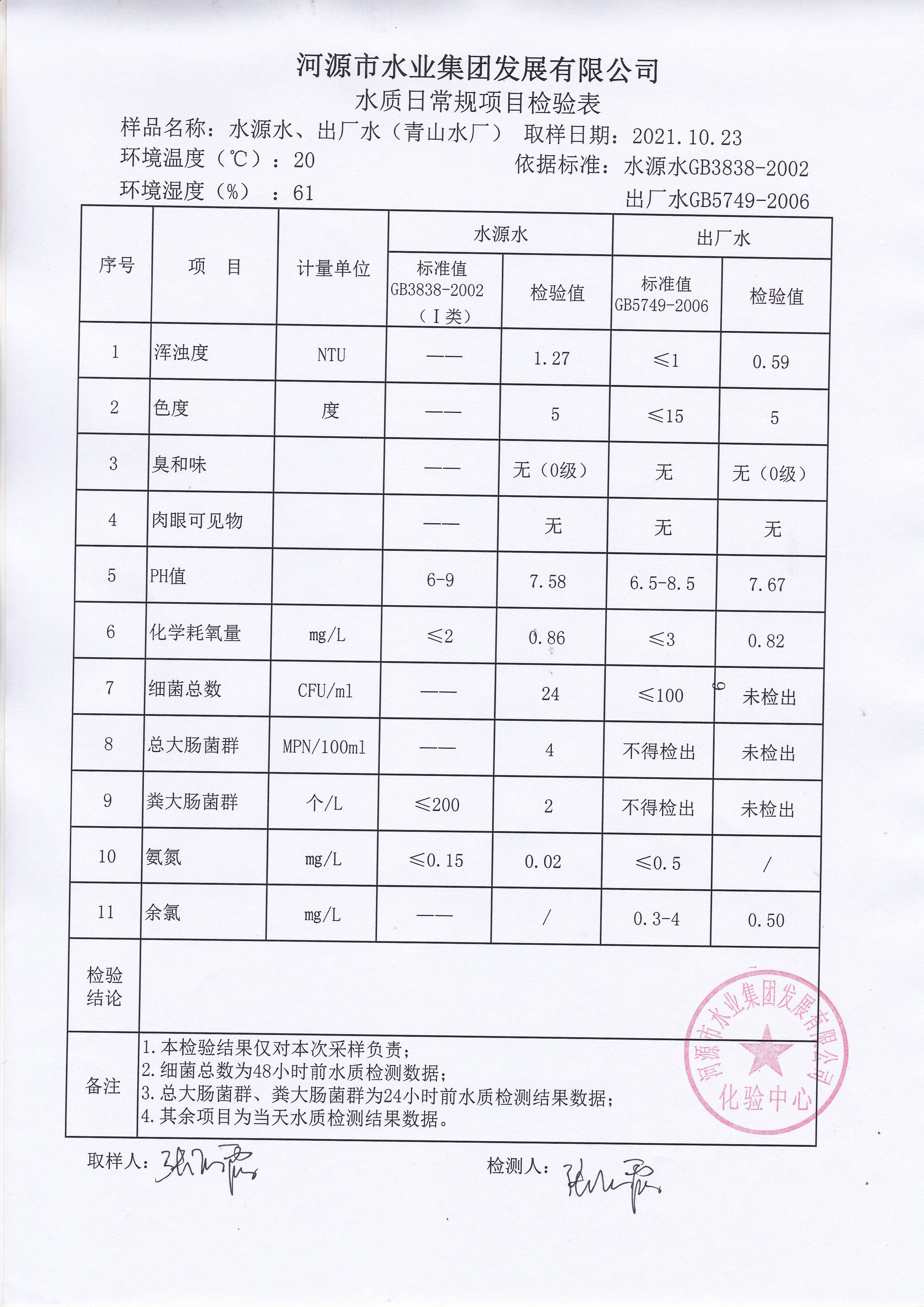 2021年10月23日水質(zhì)檢驗(yàn)報(bào)告