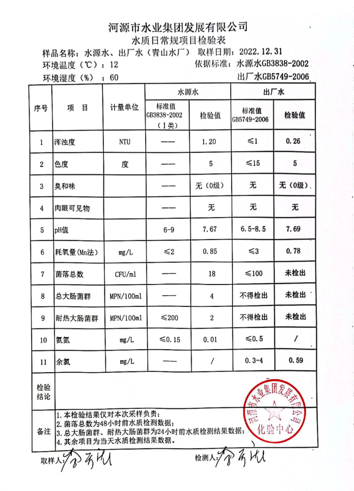 2022年12月31日水質(zhì)檢驗(yàn)報(bào)告