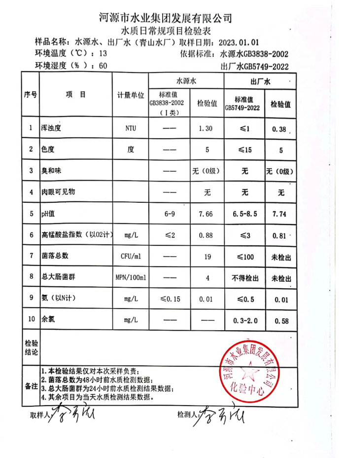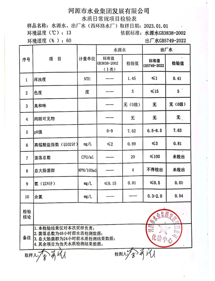 2023年1月1日水質(zhì)檢驗(yàn)報告