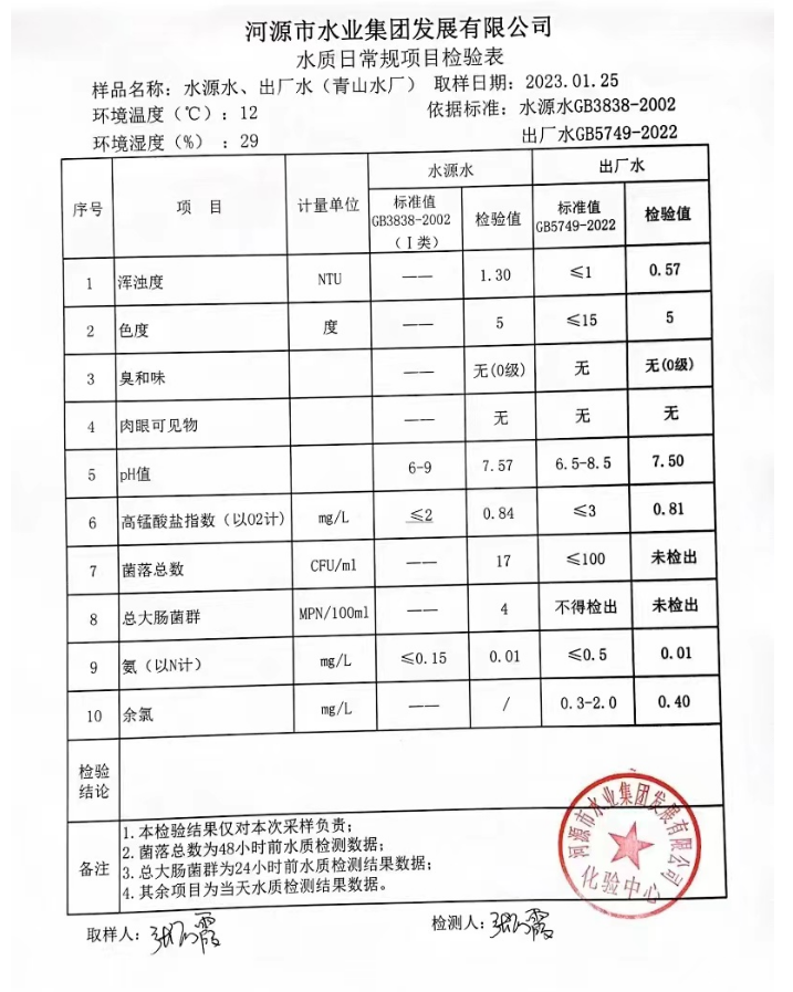 2023年1月25日水質(zhì)檢驗報告