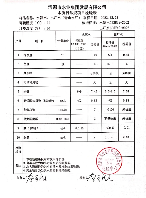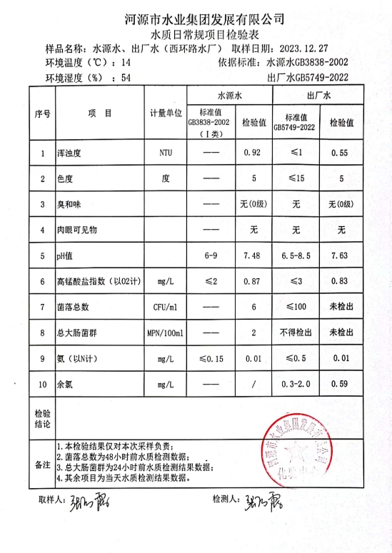 2023年12月27日水質(zhì)檢驗報告