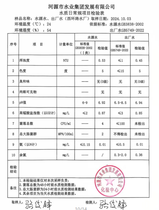 2024年10月3日水質(zhì)檢驗(yàn)報(bào)告
